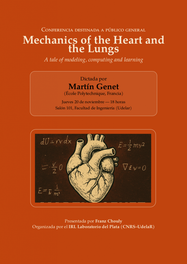 Le 20 novembre 2025, la Facultad de Ingeniería de l’Universidad de la República a accueilli un exposé grand public animé par Martin Genet, un événement marquant l’inauguration d’un nouvel axe de recherche intitulé « Analyse numérique, EDPs et Applications » au sein du Laboratoire del Plata.